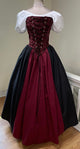 This fully layered skirt is made from a gold striped polyester velvet and billowy soft white polyester. Bands of gold trim hold the upper skirt in a fairy tale like fashion. Easy lace-up back allows for a good fit.