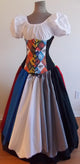 Fairy Cuff sleeve top with accenting bias tape trim. Elastic around the top and top of sleeves. Steel boned waist cincher sits at your waist and goes under the bustline. The corset is fully lined. Machine pressed grommets and black corset ties.Eight Panel Jagged Skirt in alternating colors, accented with bias tape trim. This skirt has elastic waist. Length measures 36" from waist to longest point.