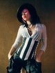The 3-Tie bodice is fully lined with steel boning around the front, sides, and back. This bodice front panel is a fantastic skull design print, with black sides/back. The two separate gathered elastic waist jagged skirts have full circle spins, and measure 22" from waist to longest point. Black fabric is a poly/cotton blend, and the skull design print is a metallic brocade.